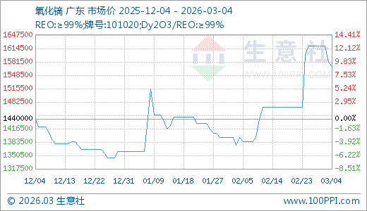 据生意社监测,氧化镝03月04日最新价格1570000.00元/吨,最近10天上涨6.80%,30天上涨12.54%,60天上涨15.44%。
