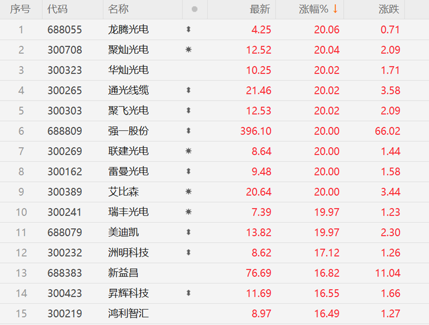 今日,A股涨幅榜前列大多数席位被“光电”包揽。