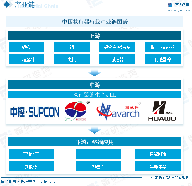 中国执行器行业产业链已形成完整体系:上游是原材料(钢材、铜、铝合金)和核心技术部件(电机、减速器、传感器),其中高端精密部件的国产化替代是当前关键;中游为各类执行器(电动、气动、液压)的研发制造与集成,市场竞争呈现国际品牌与本土企业并存的格局,产品正加速向集成传感与智能决策的“智能终端”演进;下游应用以化工、电力等传统工业为稳定基础,并正受到机器人、新能源、半导体等新兴领域的强劲拉动。整个产业链的核心趋势是沿着“国产化突破、智能化升级、与下游新兴市场协同创新”的方向持续深化。