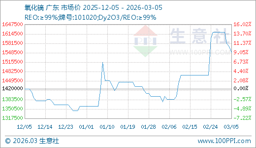 据生意社监测,氧化镝03月05日最新价格1550000.00元/吨,最近10天上涨5.44%,30天上涨12.73%,60天上涨13.97%。