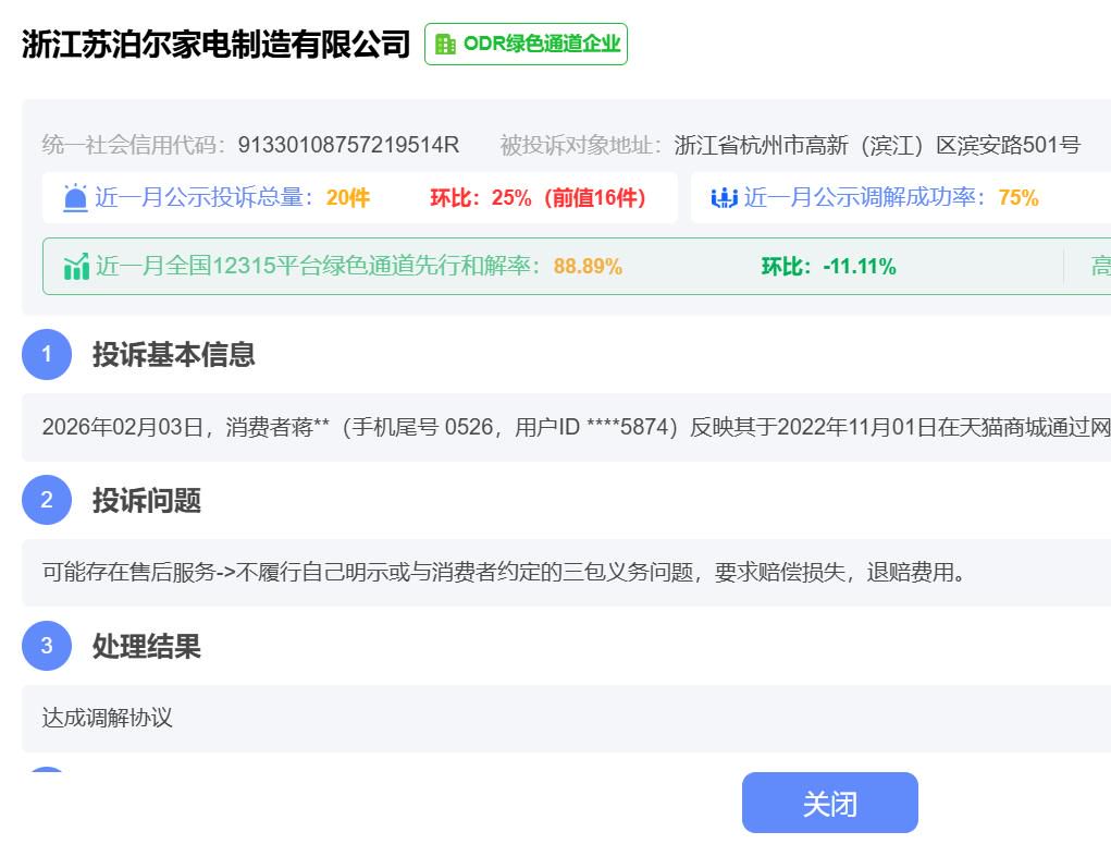 近期不乏苏泊尔产品、售后问题的相关报道。1818黄金眼近期报道,有消费者花费2450元购买的苏泊尔电饭煲,使用四五个月便出现底部掉漆、接缝处锈迹问题,售后仅同意更换外壳,拒绝退货诉求。在黑猫投诉【下载黑猫投诉客户端】平台上搜索,包含“苏泊尔”关键词的相关投诉超1万条,其中多数问题指向关于产品质量和售后服务履行“三包”义务相关的争议。全国12315消费者投诉信息公示平台数据亦显示,近一个月有关“浙江苏泊尔家电制造有限公司”的公示投诉量达20件,环比增加25%。