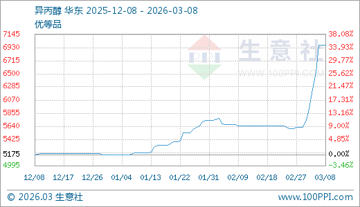 据生意社监测,异丙醇03月08日最新价格6966.66元/吨,最近5天上涨17.42%,10天上涨24.40%,60天上涨34.41%。