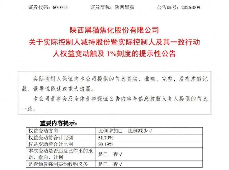 从一致行动人持股结构来看,除李保平持股变动外,陕西黄河矿业(集团)有限责任公司仍持有92202.84万股,占比45.14%;李光平持有3042万股,占比1.49%;张林兴持有2535万股,占比1.24%。四方合计持股由105791.07万股降至102511.84万股,合计持股比例跌破51%关口,进一步缩小了控股优势。公司方面在公告中明确表示,本次权益变动不触及要约收购,不会导致公司控股股东、实际控制人发生变化,也不会对公司治理结构及持续经营产生重大影响。