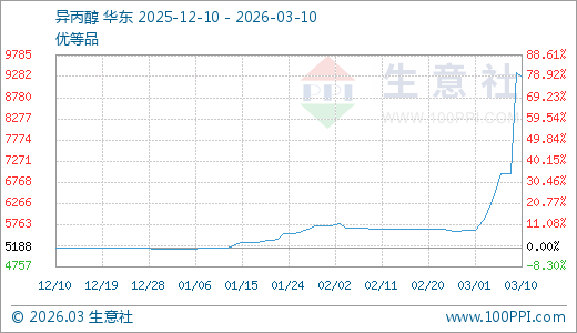 据生意社监测,异丙醇03月10日最新价格9266.67元/吨,最近5天上涨41.84%,10天上涨64.74%,60天上涨78.21%,90天上涨78.61%。