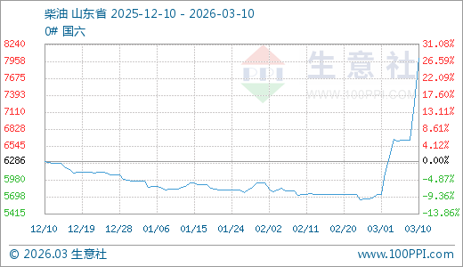 据生意社监测,柴油03月10日最新价格8005.43元/吨,最近5天上涨20.82%,10天上涨39.55%。