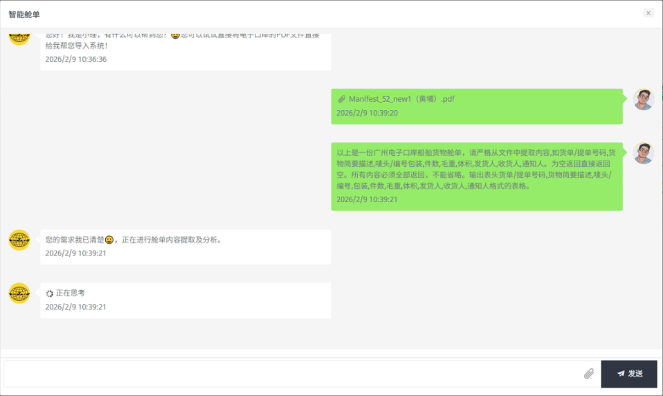 核心能力上,智能体具备高精准多模态感知能力,轻松应对中英文混排、手写模糊字体、非标格式单据等各类复杂场景,可精准抽取舱单20余个核心字段,各类复杂场景下识别准确率稳定在99.2%以上,让人头疼的“看错行、录错数”问题,从根源上得到了解决。
