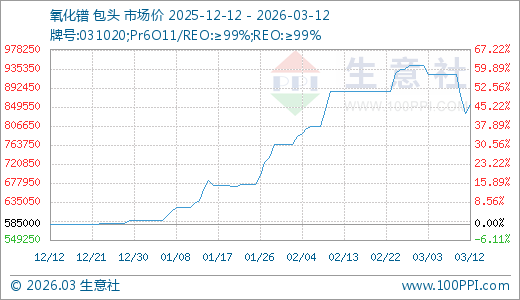 据生意社监测,氧化镨03月12日最新价格855000.00万元/吨,最近60天上涨37.35%,90天上涨46.15%。