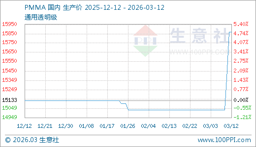 据生意社监测,PMMA03月12日最新价格15866.67元/吨,最近5天上涨5.54%。