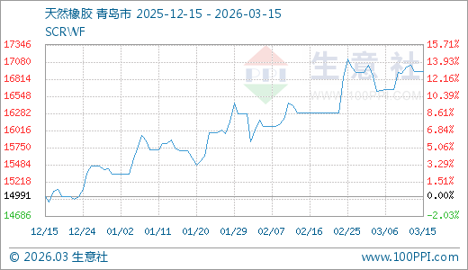 据生意社监测,天然橡胶03月15日最新价格16933.33元/吨,最近20天上涨3.99%,60天上涨6.72%,90天上涨12.95%。
