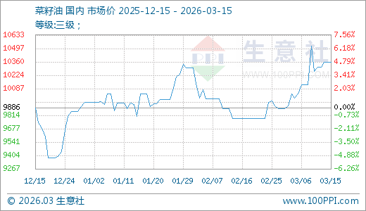 据生意社监测,菜籽油03月15日最新价格10360.00元/吨,最近10天上涨3.29%,20天上涨5.93%。