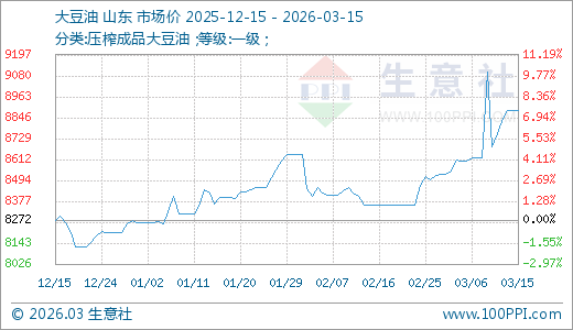 据生意社监测,大豆油03月15日最新价格8884.00元/吨,最近10天上涨3.30%,20天上涨6.34%,90天上涨7.40%。