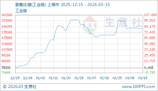 氢氧化锂03月15日最新价格141000.00元/吨,最近20天上涨7.63%,90天上涨80.00%。