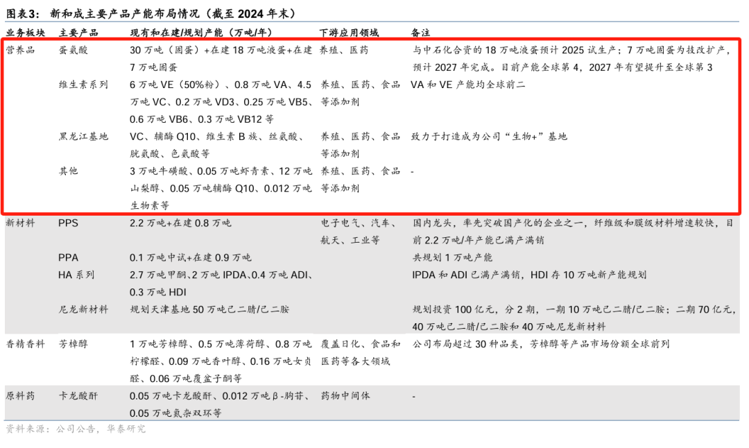 新和成是全球维生素领域绝对的龙头,截至2024年末,新和成的维生素A、维生素E、维生素C年产能分别为0.8万吨、6万吨和4.5 万吨,分别居全球第2、第1和第3。