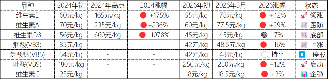 本轮维生素涨价由上游成本提价而驱动,同时欧美主要产能方获取石油衍生合成原料成本更高改善国内产能的市场竞争力,本轮涨价高度跟随油价(中东冲突的时间轴),不过从目前各个品种的涨幅来看,似乎上涨幅度远不及2024年,可能后面随着局势变化仍有不小的空间。