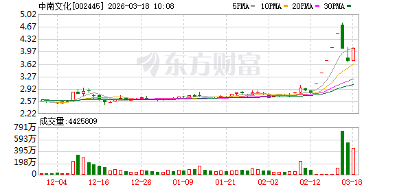 中南文化再度涨停,8个交易日内录得6个涨停,累计涨幅为46.40%,累计换手率为76.38%。截至9:45,该股今日成交量3.76亿股,成交金额14.96亿元,换手率15.88%。最新A股总市值达96.73亿元,A股流通市值96.31亿元。
