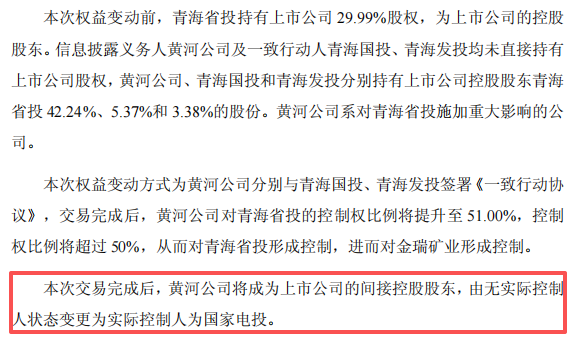 交易完成后,黄河公司对青海省投的控制权比例提升至51%,对青海省投形成控制,进而对金瑞矿业形成控制。黄河公司成为金瑞矿业的间接控股股东,金瑞矿业也由无实际控制人状态变更为实际控制人为国家电投。