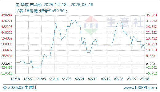 据生意社监测,锡03月18日最新价格369410.00元/吨,最近90天上涨10.93%。