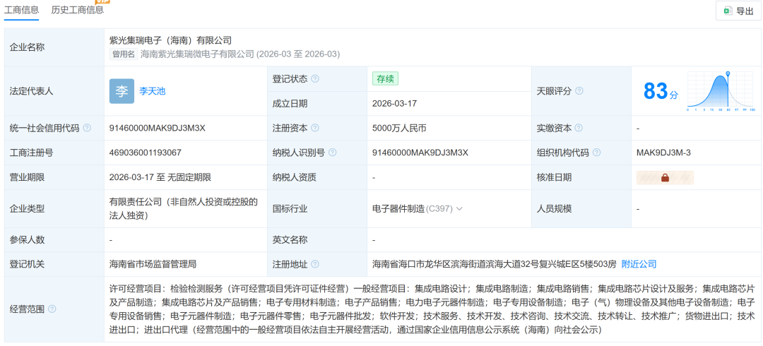 天眼查显示,紫光集瑞电子(海南)有限公司于2026年3月17日正式成立,法定代表人为李天池,注册资本5000万元,由紫光国微间接全资持股。