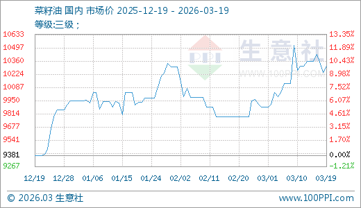 菜籽油03月19日最新价格10310.00元/吨,最近20天上涨4.31%,30天上涨5.42%,90天上涨9.90%。