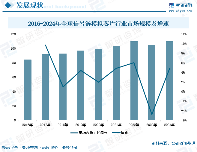 信号链模拟芯片作为连接物理世界与数字系统的桥梁,其需求与工业自动化、汽车电子、人工智能及5G通信等领域紧密相关。随着智能制造、电动汽车和AIoT的普及,对高精度传感器信号处理、电源管理及数据转换的需求持续上升,推动市场规模稳步增长。数据显示,2016-2022年全球信号链模拟芯片行业市场规模持续增长,到了2023年受半导体行业下行周期影响,全球信号链模拟芯片行业市场规模有所收缩,但随后2024年逐渐恢复,市场规模达到110亿美元,同比上涨4.8%。
