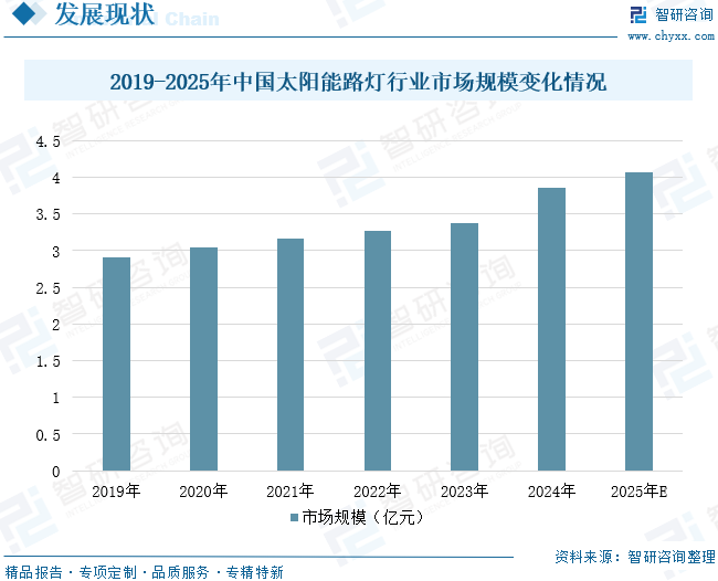 我国太阳能路灯市场在近年来展现出显著的增长潜力。尽管当前总体建设规模尚处于发展阶段,但其产业历程已历经从技术探索与初步应用,到市场推广与普及,并正加速迈向规模化扩张与智能化升级的新阶段。在持续的技术进步与不断扩大的应用需求双重驱动下,行业规模稳步拓展,前景可观,正逐步在照明领域崭露头角并占据愈发重要的地位。数据显示,中国太阳能路灯行业市场规模从2019年的2.91亿元增长至2024年的3.85亿元,年复合增长率为5.76%。太阳能路灯作为一种绿色、环保、节能的照明设备,具有广阔的市场前景。随着光伏及储能技术的持续进步与成本优化,太阳能路灯将进一步向智能化方向演进,通过深度融合智能控制系统与物联网技术,实现照明系统的远程监控、精细化管理和能效优化。同时,在产品设计与材料选择上也更加注重全生命周期的环境友好性与可持续性。在此基础上,2025年中国太阳能路灯行业市场规模将增长至4.07亿元。