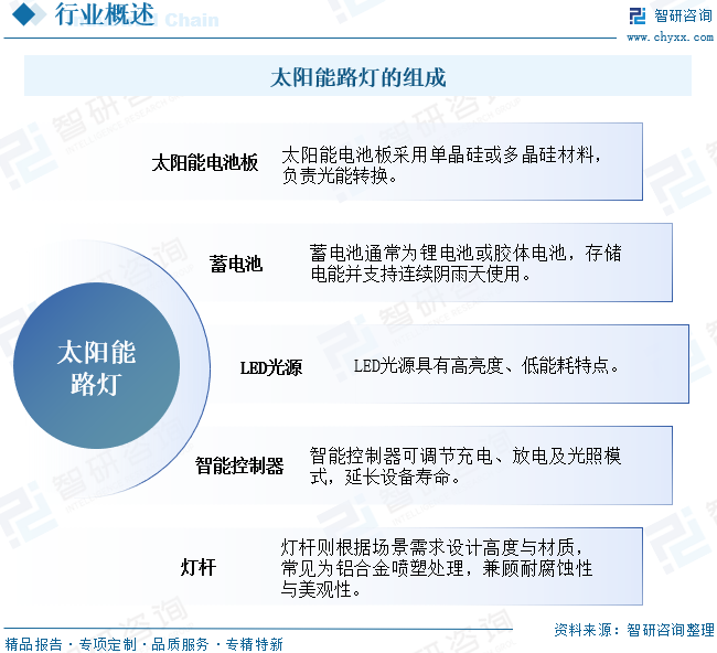 太阳能路灯产业链主要包括上游原材料供应、中游的制造和组装以及下游应用。上游原材料主要包括太阳能电池板、锂电池、LED灯珠、智能控制器、钢材、热镀锌钢管、铝合金、玻璃、塑料等。产业链中游为太阳能路灯的制造和组装环节。产业链下游为应用领域,包括公园、广场、景区、住宅小区、城乡道路等场所。
