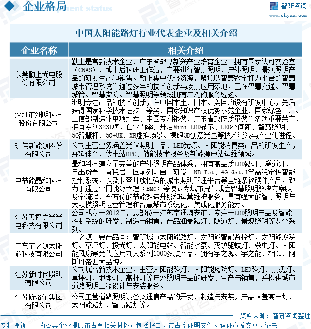 当前中国太阳能路灯行业竞争格局呈现“多元并存、分层竞争”的态势。市场由全国性品牌与大量区域性厂商共同构成,头部企业在品牌影响力、技术研发及全国性项目承接能力上具有优势,专注于提供包含智能控制系统的整体解决方案。而数量众多的中小型企业则凭借灵活性和本地化服务,在区域性市场及细分应用场景中占据重要地位。行业竞争正从单一的产品价格与基础性能竞争,逐步转向以系统效率、智能化管理水平、全生命周期成本以及特定场景定制化能力为核心的综合竞争。未来,具备核心技术迭代能力、成熟智能管理平台及强大项目落地服务能力的企业,将在市场整合中进一步强化其竞争优势。目前,中国太阳能路灯行业代表企业主要包括东莞勤上光电股份有限公司、深圳市洲明科技股份有限公司、珈伟新能源股份有限公司、中节能晶和科技有限公司、江苏天楹之光光电科技有限公司、广东宇之源太阳能科技有限公司、江苏新时代照明有限公司、江苏斯洛尔集团有限公司等。