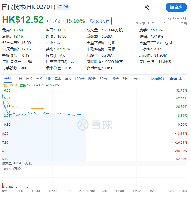 截至午间收市,国民技术每股收报12.52港元,涨15.93%,目前总市值约84.90亿港元。