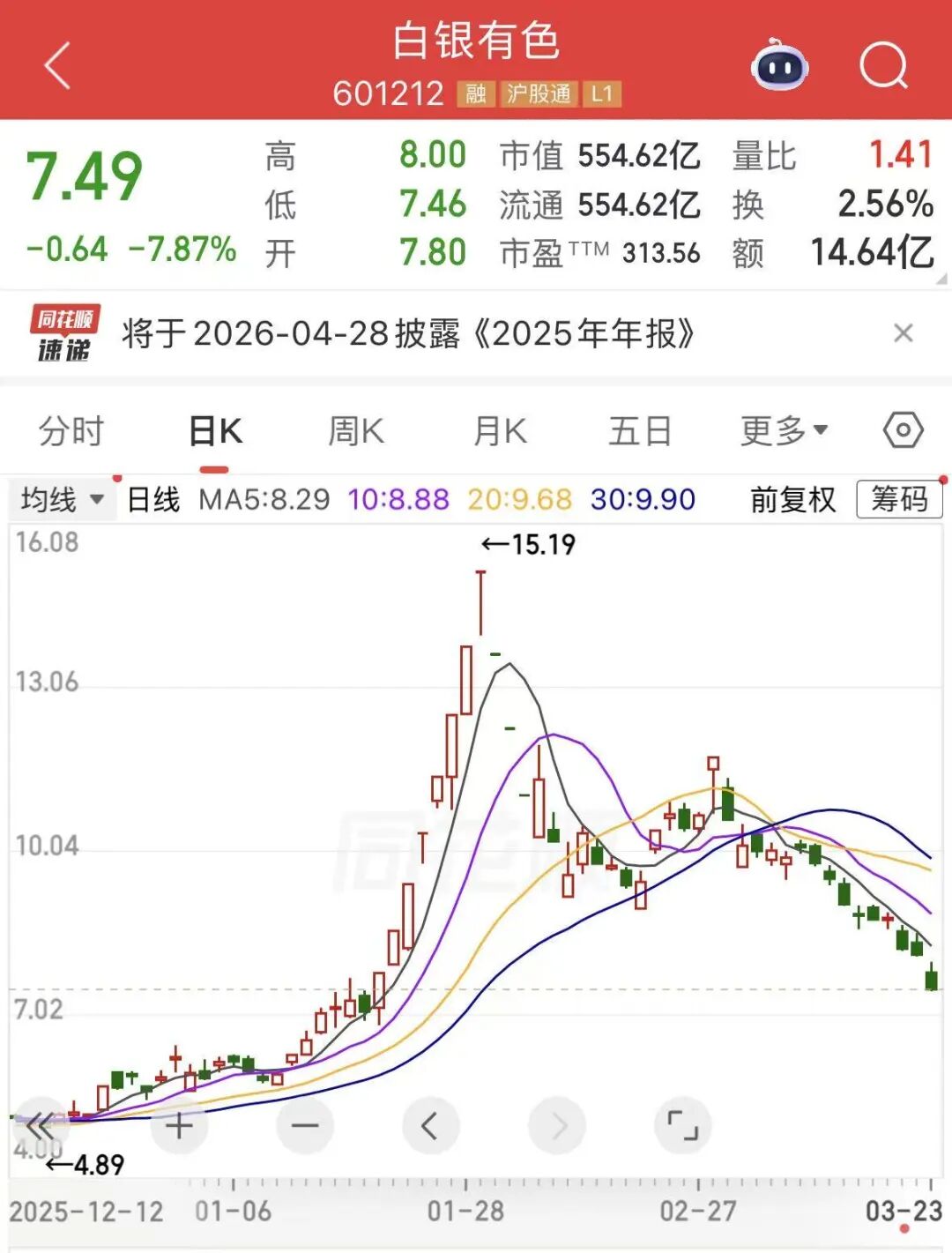 近期,贵金属价格波动是上述两只个股股价大幅回调的主要原因。3月23日,白银2606合约重挫,逼近15000元,相比1月底高点已经跌超50%。