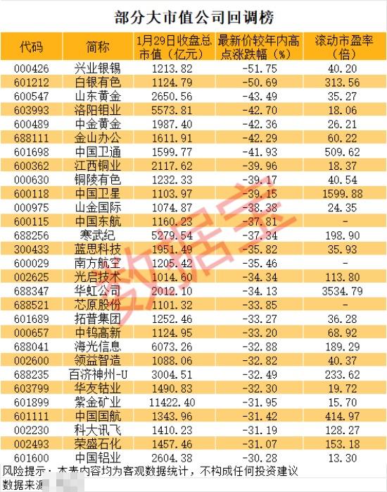 还有哪些大市值个股股价出现了大幅回调?数据显示,1月29日收盘总市值超过千亿元的个股中,有29股最新价较年内高点回调超30%。其中,山东黄金、洛阳钼业、中金黄金等个股回调均超40%。
