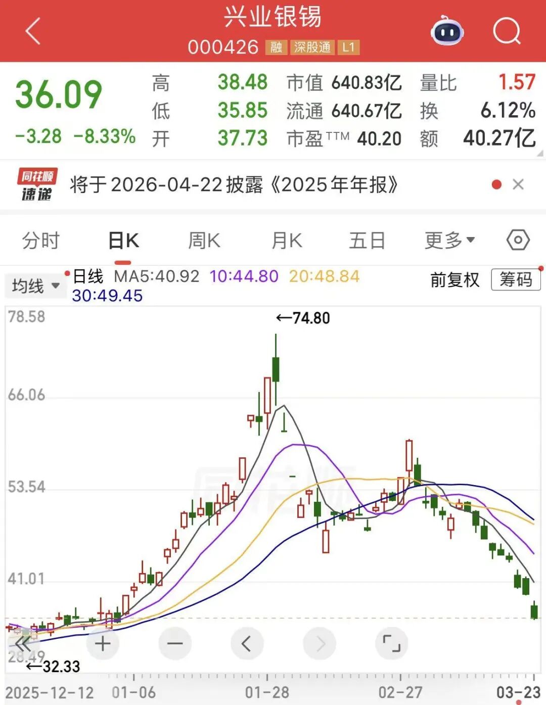 今日(3月23日),兴业银锡股价继续大幅回调,盘中最低跌破36元/股。截至收盘,该股报36.09元/股,下跌8.33%。不论是以收盘价还是盘中最低价计算,该股股价相对1月29日的高点均已跌超一半。行情软件显示,1月29日,兴业银锡股价一度触及74.8元/股。值得一提的是,兴业银锡1月29日收盘总市值超过1200亿元。
