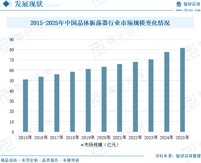 中国大陆晶体振荡器行业起步相对较晚,早期核心生产设备主要依赖进口,产品应用领域也集中于消费电子及小型电子设备等中低端市场。近年来,在高端晶体振荡器国产替代的行业趋势推动下,国内厂商凭借逐步积累的技术创新能力与成本优势,正不断崛起并在全球市场中占据日益重要的地位。当前,国内对高端晶体振荡器的需求持续快速增长,进一步激励企业加快产能布局与研发升级,不断提升高端产品的自主供应能力,推动行业向更高附加值方向加速转型。从市场规模来看,2015-2025年中国晶体振荡器行业市场规模从50.97亿元增长至81.68亿元,年复合增长率为4.83%。未来,随着5G通信、物联网、人工智能及车载电子等新兴领域的持续发展,对高精度、高稳定性晶体振荡器的需求将进一步释放。