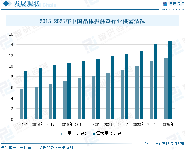 晶体振荡器被喻为“芯片的心脏”。它基于石英晶体的压电效应工作,通过将电能与机械能相互转换,输出频率稳定、精度高的周期性电信号,为电子设备的逻辑运算、数据传输、时序控制提供基础保障。1921年,Walter Guyton Cady制造了第一个石英晶体振荡器,标志着晶振技术的诞生。20世纪40至50年代,随着电视与雷达技术的兴起,晶体振荡器的市场需求进一步扩大。进入21世纪以来,随着5G、物联网、新能源汽车的快速发展,市场对高精度、高稳定性的晶体振荡器需求不断增加。数据显示,中国晶体振荡器行业产量从2015年的5.62亿只增长至2025年的11.45亿只,年复合增长率为7.38%;需求量从2015年的9.07亿只增长至2025年的14.75亿只,年复合增长率为4.98%。未来,随着5G及以上技术和物联网的持续快速发展,以及国产替代的加速,我国晶体振荡器行业供需规模有望进一步扩大。
