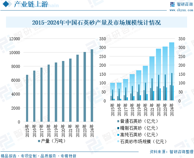 石英砂是晶体振荡器的原材料之一。晶体振荡器的核心部件是石英晶体,它是由天然或合成的石英(主要成分为二氧化硅)经过切割、抛光、电镀和封装等精密工艺制成的。而石英砂是石英矿石经过破碎、选矿和提纯后得到的颗粒状原材料,是生产石英晶体的重要材料。作为重要的工业矿物原料,石英砂广泛用于玻璃、铸造、陶瓷及防火材料、冶炼硅铁、冶金熔剂、冶金、建筑、化工、塑料、橡胶、磨料,滤料等工业。近年来,在下游产业需求增长的推动下,我国石英砂产量呈现增长态势。数据显示,中国石英砂产量从2017年的7786万吨增长至2024年的10438万吨,年复合增长率为4.28%。与此同时,在需求增长以及产品价格上扬的双重提振下,中国石英砂规模也呈现逐年增长的态势。2024年中国石英砂市场规模为327.58亿元,同比增长7.77%。其中,普通石英砂市场规模为87.91亿元,同比增长8%;精制石英砂市场规模为155.44亿元,同比增长5.24%;高纯石英砂市场规模为84.23亿元,同比增长12.77%。未来,随着石英砂行业持续发展以及高纯度产品供应能力提升,将为下游晶体振荡器等行业提供更为稳定的原材料保障。