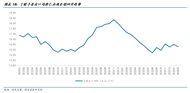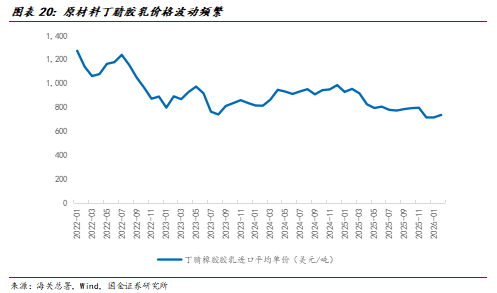 过去丁腈胶乳价格波动较为频繁,主要受原油价格及丁腈胶乳市场供需格局变化影响。根据海关总署的数据,2026年2月,丁腈橡胶胶乳进口平均价格在713.36美元/吨,目前原材料由于上游运输供应等问题影响呈现明显上涨趋势,在2020-2021年下游需求较为旺盛时达到过2500美元/吨以上。下游手套企业如果能布局上游丁腈胶乳产业,将能够有效较少原材料价格波动带来的风险。