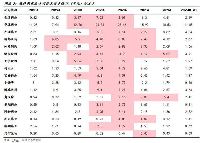 原料药上一轮扩产主要集中在2020-2022年。我们统计了17家原料药企资本开支情况,其中大部分企业均在2021-2022年大幅增加资本开支,进行产能扩张。2023年,资本开支边际减少,扩产进入尾声。