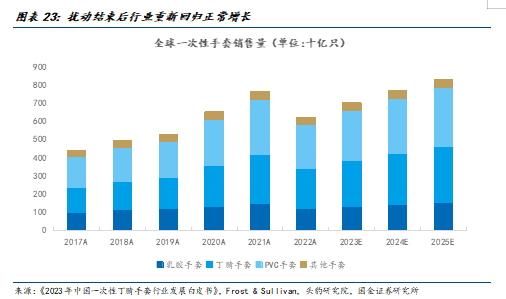 回顾一次性手套过去几年销售量变化,从2017年的4409亿只增长到2021年的7670亿只,复合增速达到14.8%,2022年由于全球公共卫生事件带来的需求进入尾声,需求量下降到6225亿只。未来随着民众的健康卫生意识提升、不断沉淀防护用品的使用习惯,以及医疗行业针对手套使用标准的规范制定,预计全球一次性手套行业还将保持稳定增长。