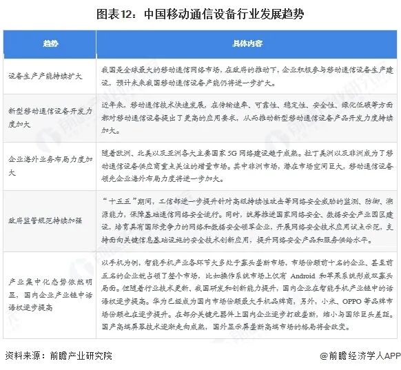展望未来,中国移动通信设备行业将呈现行业产能进一步扩大、新型设备研发力度加强、海外布局加速、监管持续加强、集中度持续提升等趋势。