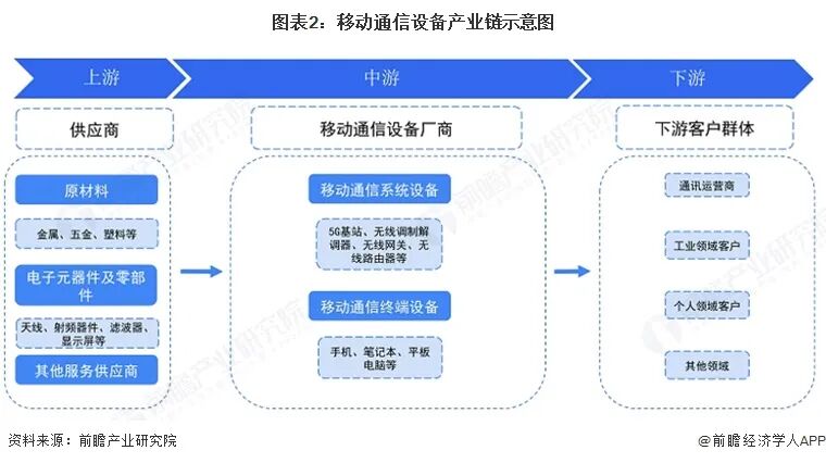 移动通信设备产业链上游行业主要包括金属、五金和塑料等原材料行业,电子元器件和移动通信设备零部件制造行业以及软件系统、配套设施等其他行业;移动通信设备产业中游作为整条产业链的重要环节,主要包含移动通信系统设备制造和移动通信终端设备制造;移动通信设备产业下游主要包括通信运营商与通信设备集成商以及各领域客户。