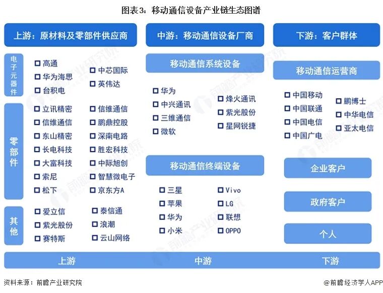 移动通信设备产业上游涉及到众多细分行业,各细分行业上游供应商繁多,代表企业包括安卓、苹果、高通、华为海思、中芯国际等;产业链中游包中兴通讯、三维通信、烽火通讯等移动通信系统设备制造商以及华为、小米、苹果等移动通信设备终端制造商;产业链下游覆盖范围众多,包括中国移动、中国电信等运营商,以及各类客户群体。