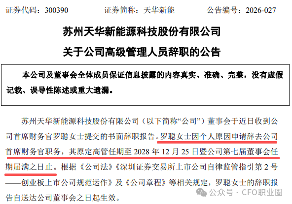 3月23日,该公司发布了《关于公司高级管理人员辞职的公告》。公告显示,仅上任3个月的罗聪女士因个人原因申请辞去公司首席财务官职务,其原定高管任期至2028年12月25日暨公司第七届董事会任期届满之日止。