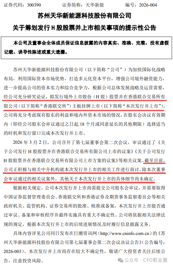 2026年3月2日,深交所创业板上市公司天华新能(300390.SZ)正式发布公告,宣布公司董事会已审议通过发行H股并在香港联交所主板上市的相关议案,目前正在与中介机构商讨具体细节。