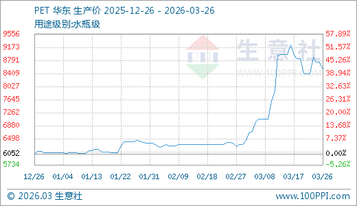 据生意社监测,PET03月26日最新价格8522.50元/吨,最近20天上涨20.63%,30天上涨33.58%,90天上涨40.81%。