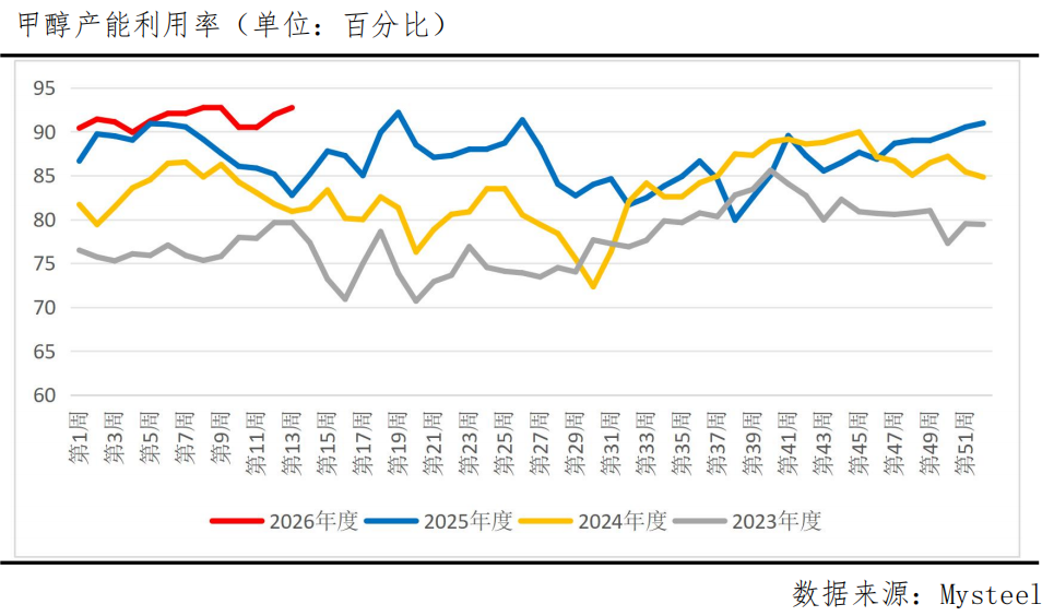 面对进口的骤减,国内供应端虽然表现出积极的响应,但潜力已显不足。截至3月26日当周,国内甲醇产能利用率回升至92.73%,处于历史高位区间。高利润确实驱动了企业维持高负荷生产,甚至暂缓检修,但这也意味着一旦进口缺口继续扩大,国内供应几无增量空间来填补。