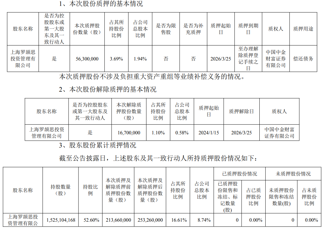 上海罗颉思投资管理有限公司于2026-03-25解除质押1670万股,占所持股比例为1.10%,占总股本比0.58%,剩余质押2.533亿股(该笔质押起始日2024-01-15)。