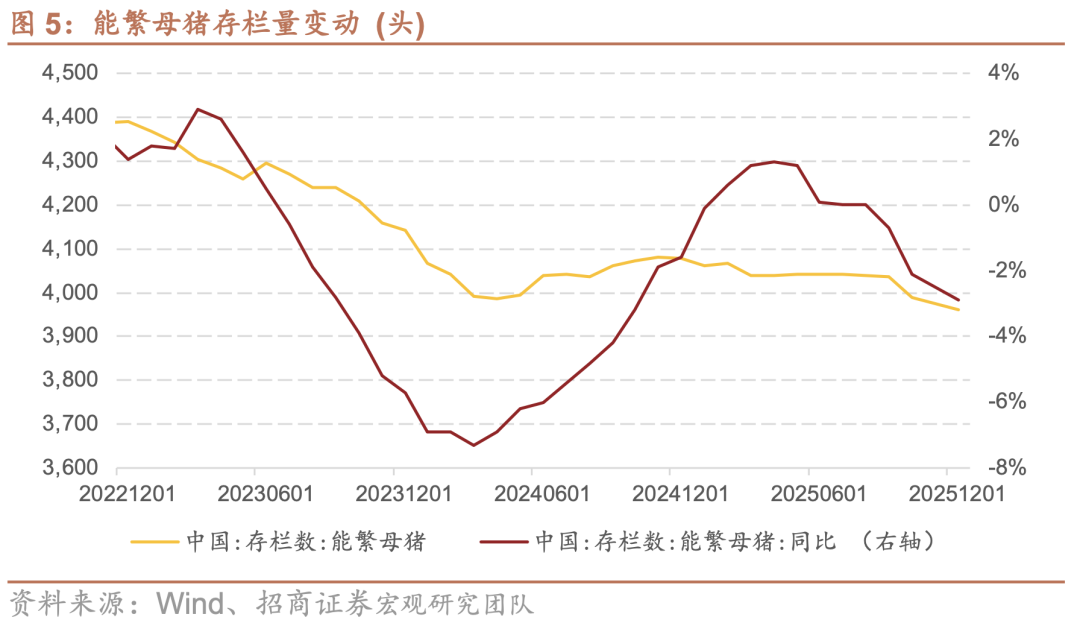 周期底部的核心标志,是养殖主体在持续亏损压力下被迫淘汰能繁母猪,启动产能去化进程。如图5所示,进入2025年9月后,随着行业亏损面扩大及现金流压力加深,产能去化明显提速:9月能繁母猪存栏同比转负至-0.7%,10月及12月同比增速分别降至-2.1%和-2.9%,显示去产能力度逐步强化、行业出清进程加快。由于能繁母猪存栏量决定了约10个月后的商品猪出栏能力,当前去化力度的持续强化,预示着2026年下半年商品猪供给将迎来趋势性收缩,供需关系有望改善,为猪价上行积蓄势能。