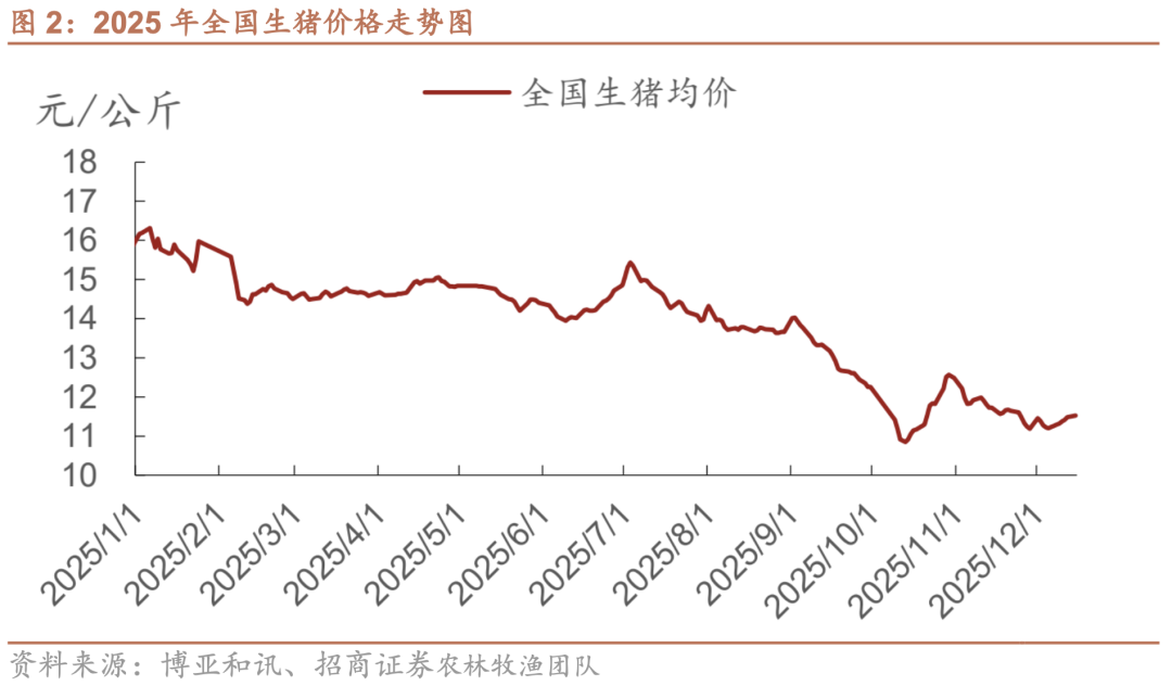 当生猪价格持续低于行业平均完全成本线时,意味着行业整体进入亏损区间,这是周期底部最直接的信号。如图2。所示,截至2025年10月末,市场猪肉平均价格较年初累计下跌约21%,呈现“旺季回落”的特征。根据博亚和讯数据,2025年10月全国生猪均价为11.6元/公斤,同比下降34%、环比下降11%。
