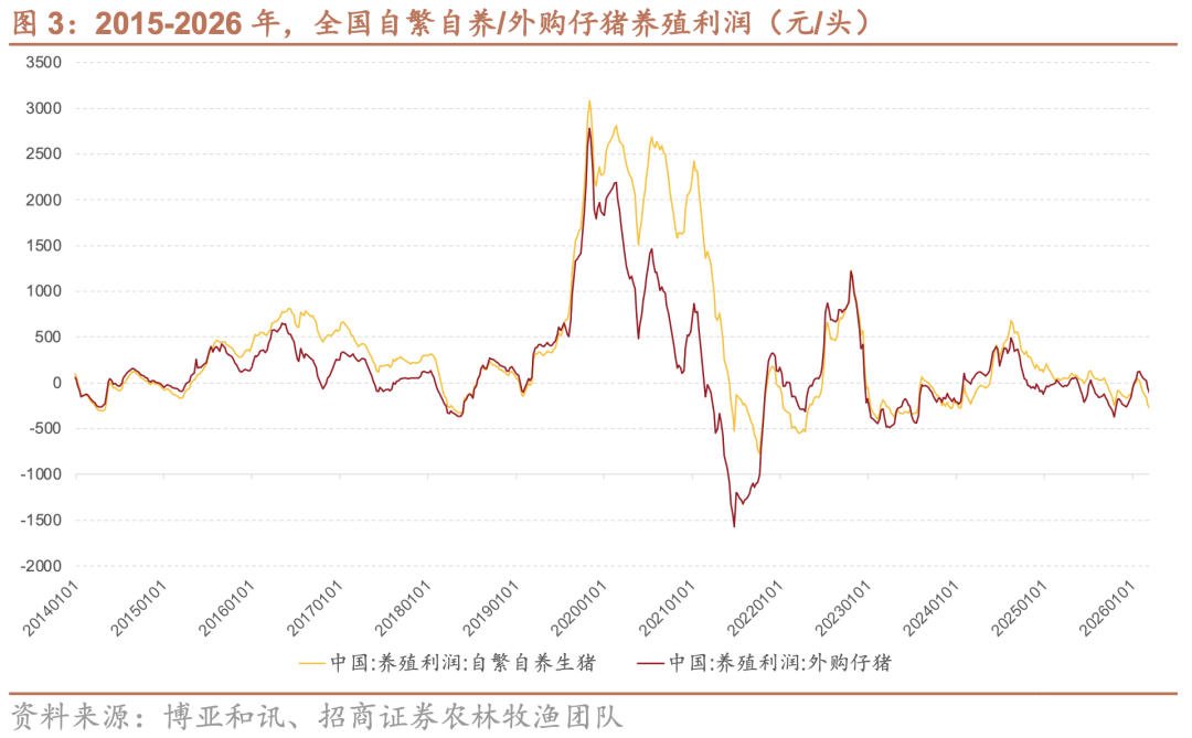 价格持续下行推动行业进入全面亏损状态,如图3所示,截至2025年12月12日,全国自繁自养与外购仔猪模式的头均亏损分别扩大至163元和241元。