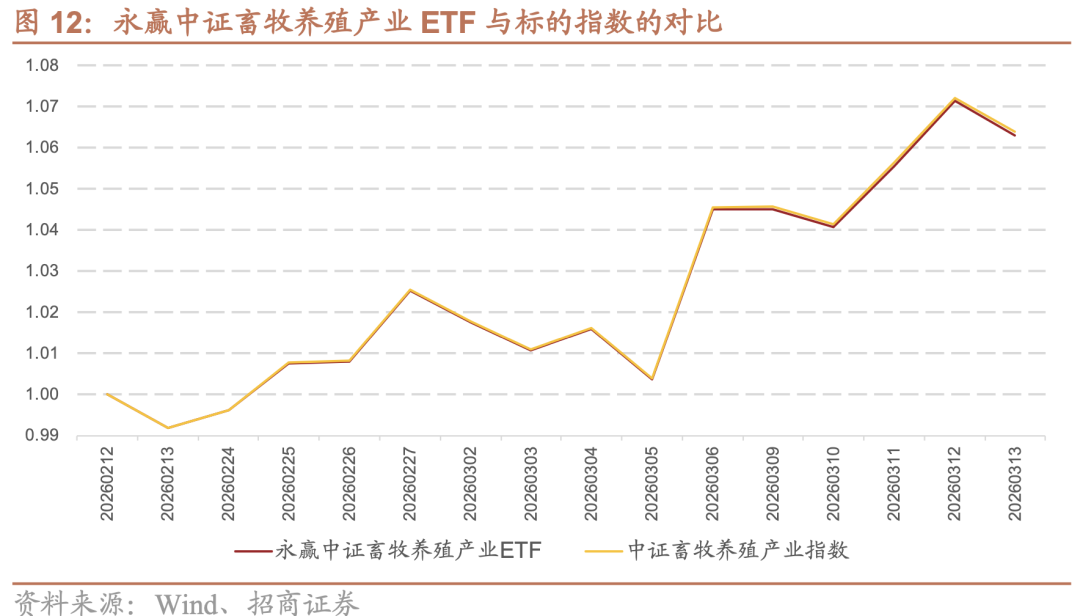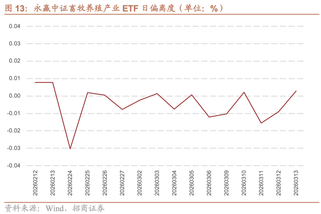 图12展示了2026年2月12日至2026年3月13日期间,永赢中证畜牧养殖产业ETF与中证畜牧养殖产业指数的净值走势。从数据看,ETF净值与指数走势高度吻合,几乎完全重合。从公开发行日开始,ETF净值与指数净值的差异始终控制在0.05%以内,至3月13日,ETF净值为1.0631,指数为1.0638,两者仅相差0.0007,充分验证了ETF对标的指数的精准跟踪能力。表明该ETF在猪周期行情启动阶段实现了极高的跟踪精度。