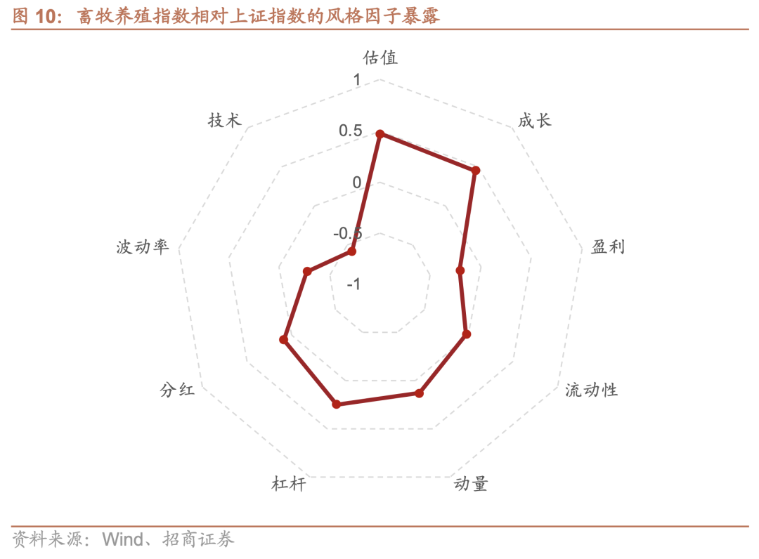 从指数风格因子暴露来看,畜牧养殖指数当前呈现出高分红、低估值、低波动的风格特征。